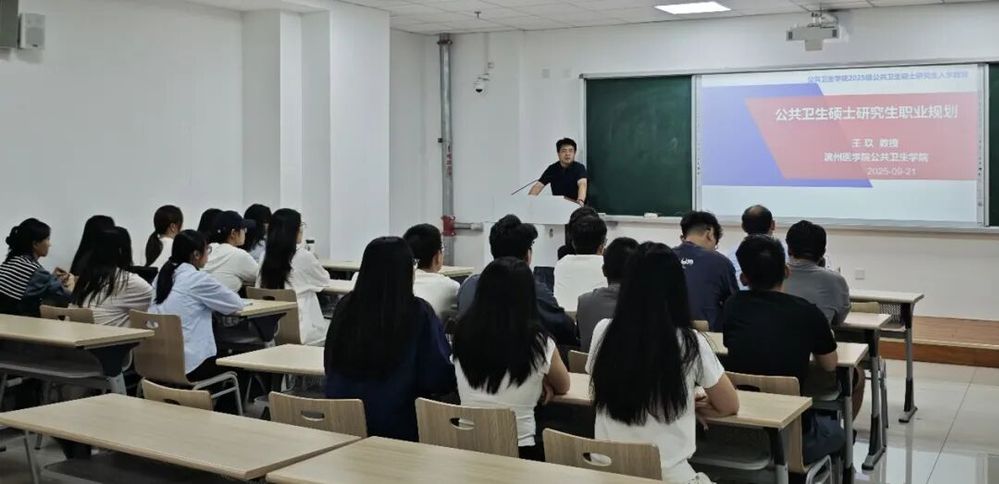 王玖教授先以“公共卫生硕士研究生职业规划”开篇,引导新生从兴趣、技能、价值观、性格四维度定位自我,梳理公共卫生核心就业领域并给出研究生阶段职业行动计划,还推荐“PDCA循环管理法”。随后他解读培养方案,介绍学院学科优势与“高层次复合型、应用型公共卫生专门人才”的培养目标,并强调学习年限、学分、课程学习、实践环节、学术活动、开题报告、中期考核、学位论文等培养关键环节的核心标准。