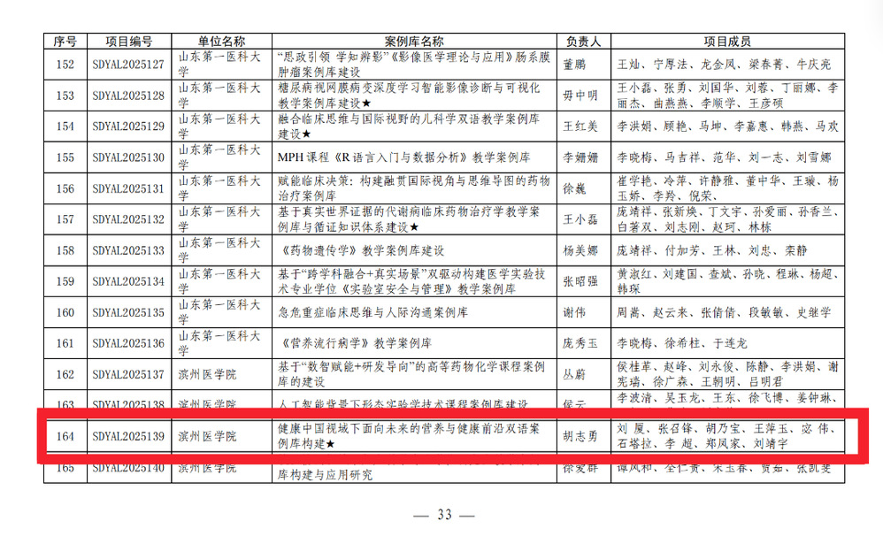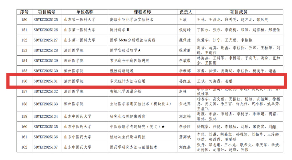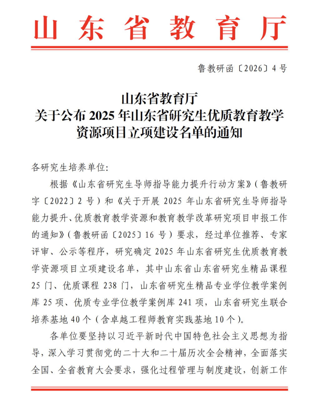 近日,山东省教育厅发布了《关于公布2025年山东省研究生优质教育教学资源项目立项建设名单的通知》(鲁教研函〔2026〕4号),公布了2025年度山东省研究生优质教育教学资源项目立项建设名单。我院孙红卫老师主持的《多元统计方法与应用》课程以及胡志勇老师主持的《健康中国视域下面向未来的营养与健康前沿双语案例库构建》项目,成功入选2025年山东省研究生优质课程立项建设名单。