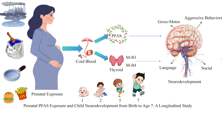 全氟和多氟烷基化合物(PFAS)是一类具有高化学稳定性与环境持久性的合成有机氟化合物,可经饮水、食物、空气及皮肤接触等多种途径进入人体,并能穿透胎盘屏障,直接影响胎儿发育。产前及婴幼儿期是神经系统发育的关键窗口期,此阶段若暴露于神经毒性物质,可能对脑发育造成难以逆转的持久性损伤。然而,现有流行病学研究结论尚不一致,PFAS的长期效应及其生物学机制仍有待深入阐明。本研究以莱州湾出生队列为基础,对221对母婴进行前瞻性随访,系统评估产前PFAS暴露对儿童1至7岁神经发育的影响,并重点探讨脐带血甲状腺激素的潜在中介效应及儿童性别差异。研究发现产前PFAS暴露可能与儿童神经发育不良存在关联、女童对产前PFAS暴露表现出更高的易感性、脐带血血清游离三碘甲状腺原氨酸(fT3)和游离甲状腺素(fT4)部分介导了PFAS对神经发育的影响。