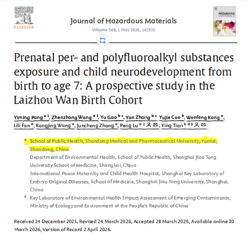 近日,学院吕鹏教授团队与上海交通大学田英老师团队合作,在环境健康领域取得重要研究进展。最新研究成果被国际著名期刊《Journal of Hazardous Materials》(影响因子12.2)录用。该研究以“产前全氟和多氟烷基化合物暴露与儿童出生至7岁神经发育的关系:来自莱州湾出生队列的前瞻性研究”为题,重点探讨了脐带血甲状腺激素的潜在中介效应及儿童性别差异。